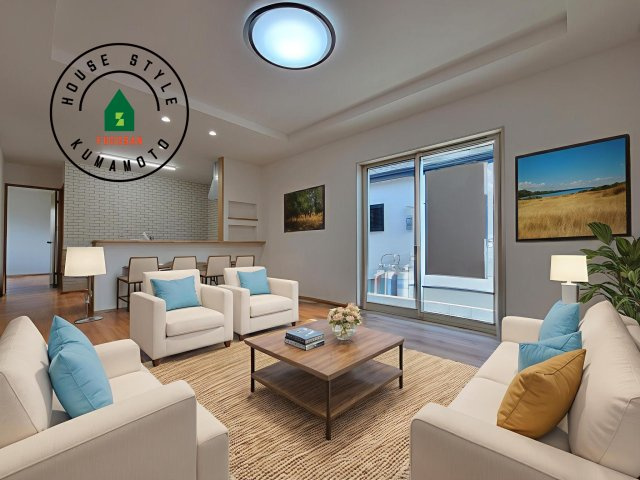 【内観:施工例】明るく開放的なリビングダイニングは豊かな陽光が注ぎ込み、やすらぎの空間を演出してくれます。ご家族で楽しいひとときをお過ごし下さい。※家具はCGを合成したものです。