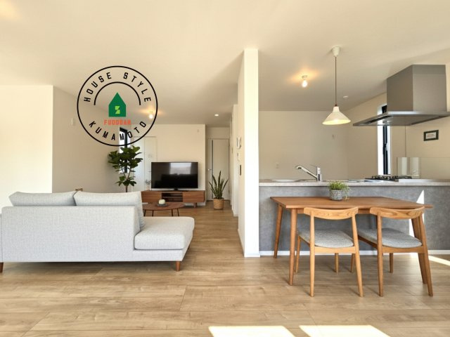 【内観:施工例】明るく開放的なリビングダイニングは豊かな陽光が注ぎ込み、やすらぎの空間を演出してくれます。ご家族で楽しいひとときをお過ごし下さい。※家具はCGを合成したものです。
